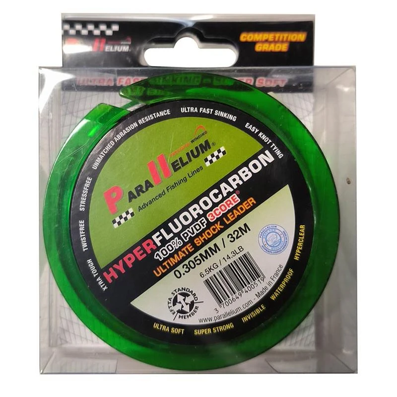 L’HyperFluorocarbon 3 Core PARALLELIUM est un fil 100 % fluorocarbone fabriqué à partir de 3 extrusions de 100 % fluorocarbone successives. Summum de la technologie, cette technique permet de réaliser un pur fluorocarbone avec des propriétés mécaniques au delà des standards.